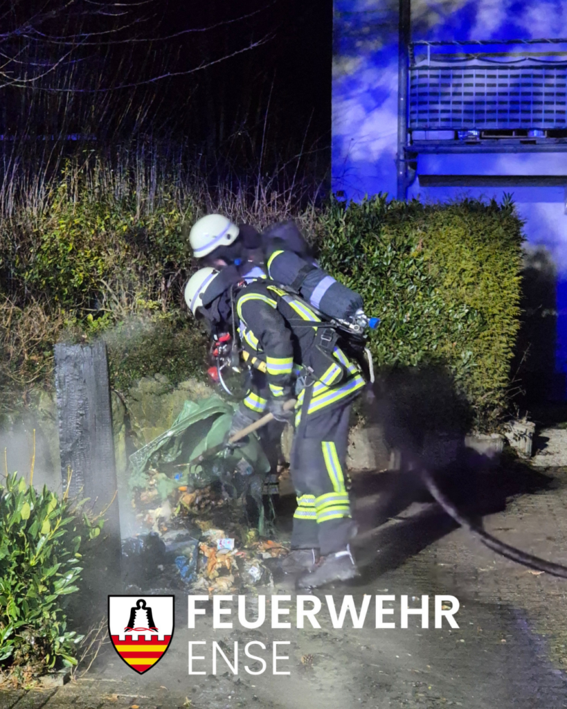 Um 02:24 Uhr erfolgte die zweite Alarmierung im neuen Jahr unter dem Stichwort „Brand 2-brennt Holzunterstand, Mülltonnen und Fassade“ zum Seinersweg in Ense-Bremen.