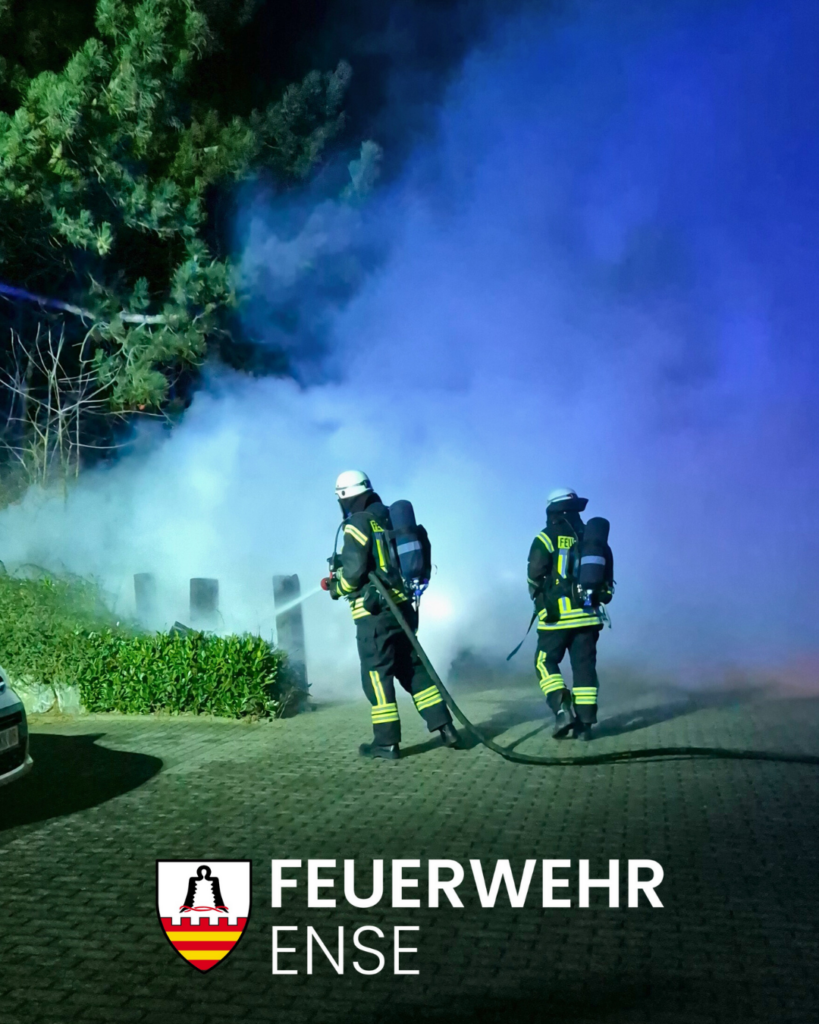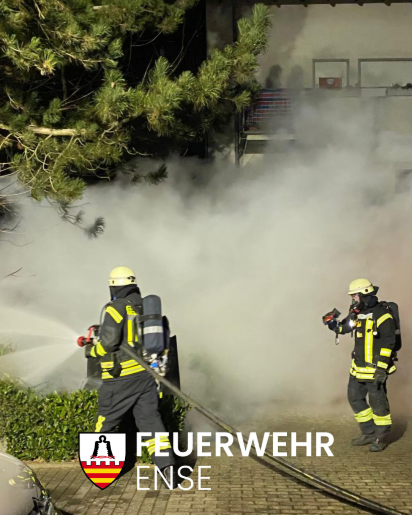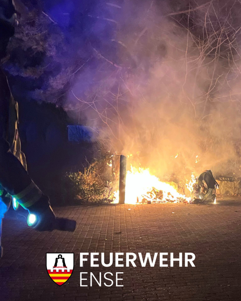 Um 02:24 Uhr erfolgte die zweite Alarmierung im neuen Jahr unter dem Stichwort „Brand 2-brennt Holzunterstand, Mülltonnen und Fassade“ zum Seinersweg in Ense-Bremen.